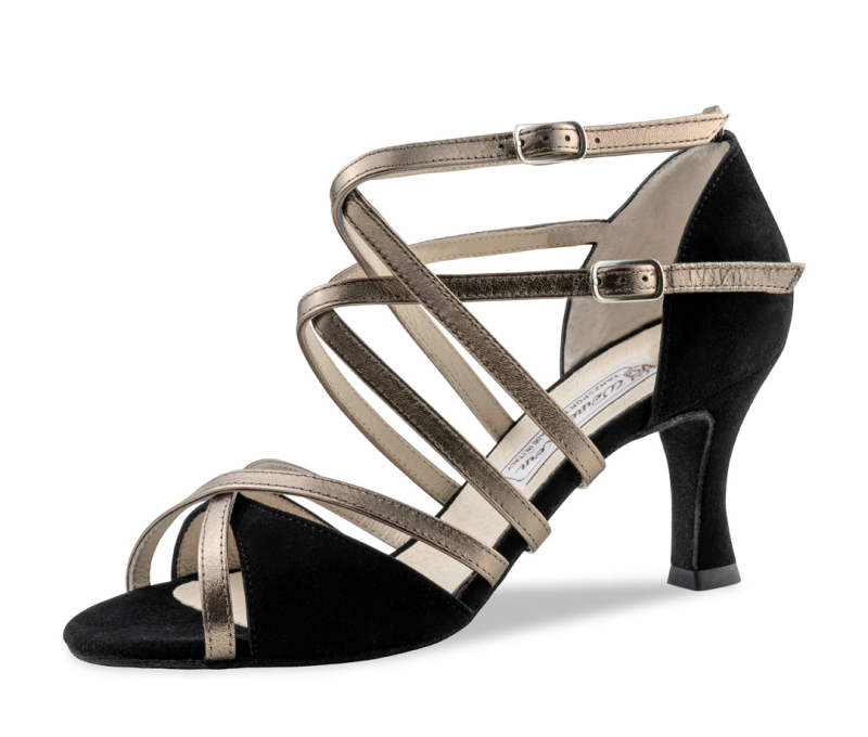Hocheleganter, ausdrucksvoller, zweifarbiger Werner Kern Tanzschuh. Exklusive Dreifach-Blattteilung und doppelte Kreuzristriemchenführung sind Extravaganz pur! Durch die sowohl unter der Sohle als auch an der Ferse individuell einstellbaren Kreuzristriemchen bietet der Schuh perfekten und äußerst bequemen Halt.